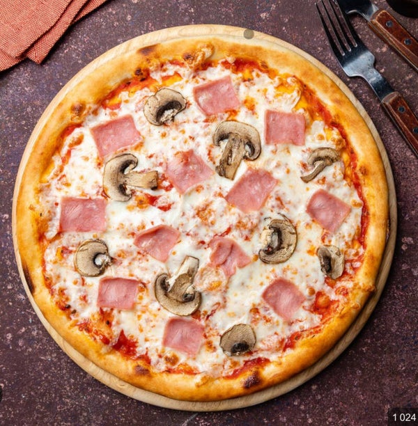 Ingrédients: farine, huile d'olive tomate, jambon, fromage, champignons et épices